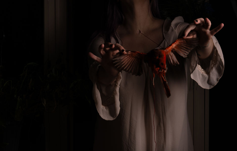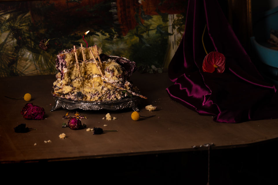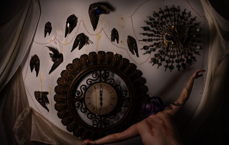 is a body of 16 photographs that are dramatized representations of emotions I’ve felt accompanied by my collected objects I’m inspired by. These theatrical scenes incorporate myself and the ephemera I am drawn to- old dolls, decaying nature, broken mannequins. Many of these items hold symbolic power seen throughout art history, particularly Baroque Dutch Vanitas.